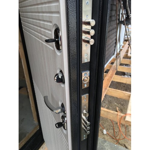 Также дверь стальная "Термаль" Беленый дуб оснащена двумя сейфовыми сувальдными замками четвертого класса взломостойкости, эксцентриком с возможностью регулировки притвора, утепленной рамой, тремя контурами уплотнения Shlegel (Германия) по периметру двери (2 конута + 1 магнитный) и тремя петлями на подшипниках.